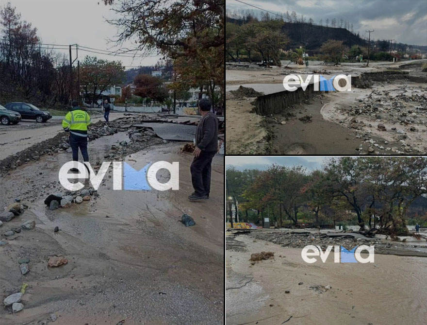 Όπως φαίνεται στις πρώτες εικόνες και βίντεο, δρόμοι έγιναν... ποτάμια, σπίτια πλημμύρισαν και φερτά υλικά κατέβηκαν από τις καμένες πλαγιές, γεμίζοντας το επαρχιακό οδικό δίκτυο, σύμφωνα με δημοσίευμα στο evima.gr. Μηχανήματα έργου δεν σταματούν απομακρύνουν βράχους, χώματα και λάσπες μετά τις κατολισθήσεις.