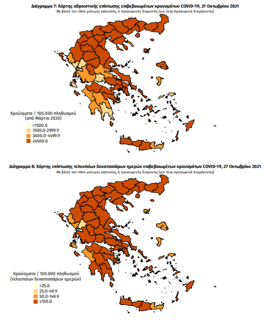 Γεωγραφική κατανομή για τα 3.651 κρούσματα σήμερα Τετάρτη 27 Οκτωβρίου 2021 - Οι πίνακες του ΕΟΔΥ