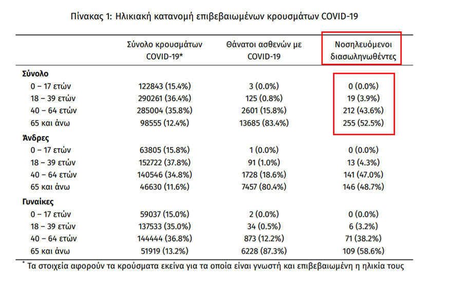 Από την έναρξη της πανδημίας Covid-19 στην Ελλάδα τα συνολικά κρούσματα κορωνοϊού έχουν φθάσει τις 801.208. Οι συνολικοί θάνατοι ανέρχονται σε 16.414. Το 95,3% των θανόντων είχε υποκείμενο νόσημα ή/και ηλικία 70 ετών και άνω. Η διάμεση ηλικία των κρουσμάτων είναι τα 38 έτη (εύρος 0.2 έως 106 έτη), ενώ η διάμεση ηλικία των θανόντων είναι τα 78 έτη (εύρος 0.2 έως 106 έτη), σύμφωνα με την ανακοίνωση του ΕΟΔΥ για τα κρούσματα σήμερα Τρίτη (9/11).