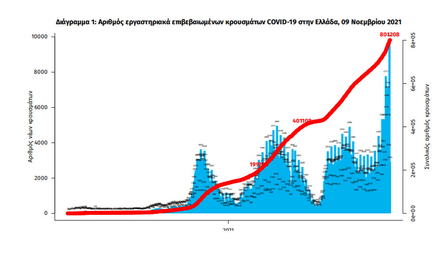 «Τα νέα εργαστηριακά επιβεβαιωμένα κρούσματα της νόσου που καταγράφηκαν τις τελευταίες 24 ώρες είναι 8.613, εκ των οποίων 19 εντοπίστηκαν κατόπιν ελέγχων στις πύλες εισόδου της χώρας. Ο συνολικός αριθμός των κρουσμάτων ανέρχεται σε 801.208 (ημερήσια μεταβολή +1.1%), εκ των οποίων 50.7% άνδρες.