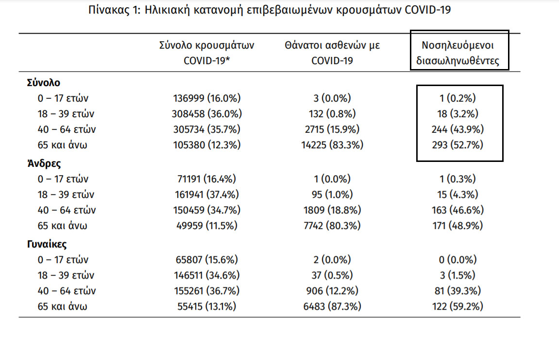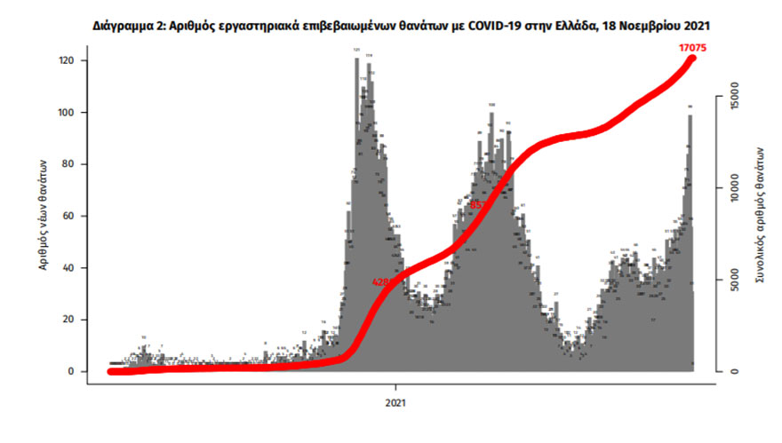 » Οι νέοι θάνατοι ασθενών με COVID-19 είναι 63, ενώ από την έναρξη της επιδημίας έχουν καταγραφεί συνολικά 17.075 θάνατοι. Το 95.3% είχε υποκείμενο νόσημα ή/και ηλικία 70 ετών και άνω.