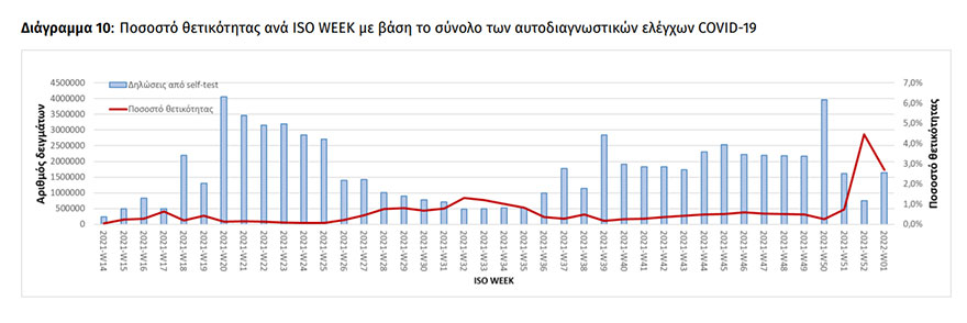 Όπως ανακοίνωσε ο ΕΟΔΥ, την εβδομάδα από 3 έως τις 9 Ιανουαρίου 2022 το ποσοστό θετικότητας ήταν 9,43% σε σύνολο 2.541.216 εργαστηριακών ελέγχων (RT-PCR/Rapid-Ag) και 2,70% σε σύνολο 1.643.264 αυτοδιαγνωστικών ελέγχων. Στο σύνολο των ελέγχων, το ποσοστό θετικότητας ήταν 5,67%.