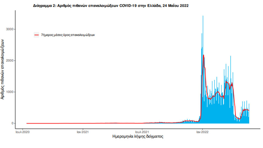Ο αριθμός πιθανών νέων επαναλοιμώξεων που καταγράφηκαν τις τελευταίες 24 ώρες ήταν 606 ενώ από την αρχή της πανδημίας SARS-CoV-2 ο συνολικός αριθμός εκτιμάται σε 132.854 (3.7% του συνολικού αριθμού των θετικών αποτελεσμάτων).