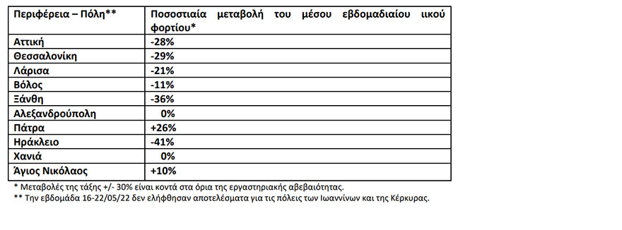 - Καθαρά πτωτικές τάσεις παρατηρήθηκαν στο Ηράκλειο (-41%) και στην Ξάνθη (-36%), ενώ οριακή ήταν η μείωση στη Θεσσαλονίκη (-29%), στην Αττική (-28%), στη Λάρισα (-21%) και στο Βόλο (-11%).