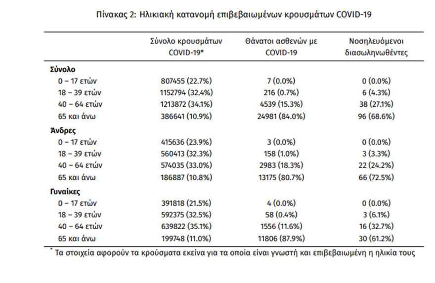 Η διάμεση ηλικία των κρουσμάτων είναι 36 έτη (εύρος 0.2 έως 112 έτη), ενώ η διάμεση ηλικία των θανόντων είναι 80 έτη (εύρος 0.2 έως 106 έτη)».