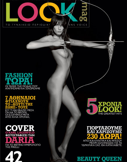 Το εξώφυλλό μας σχεδίασε ο Karl Lagerfeld. Πρόκειται για την Ουκρανοκαναδή Daria Werbowy, φωτογραφημένη για το ημερολόγιο της Pirelli, από τον Karl Lagerfeld, ως θεά Αρτέμιδα, με το τόξο της έτοιμο να εκτοξευθεί στο μέλλον.