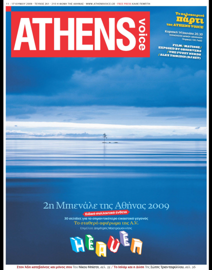 Αυτή την εβδομάδα το σχεδιάζει ο Antti Laitinen. Γεννήθηκε το 1975 στη Φινλανδία, όπου ζει και εργάζεται. Σπούδασε φωτογραφία και multimedia στα Helsinki Art Academy, Turku Art Akademy, Virrat, Media School, Kuusamo Photo School. Στο έργο του είναι φανερές οι επιρροές της φινλανδικής κουλτούρας και ο συνδυασμός πολιτισμού και φύσης. Έχει παρουσιάσει έργα του σε αρκετές ατομικές εκθέσεις, σε Αγγλία, Αμερική, Γαλλία, Σουηδία, Ελλάδα (Μουσείο Μπενάκη, 2004), Φινλανδία. Έχει συμμετάσχει επίσης σε πάρα πολλές ομαδικές εκθέσεις και σε πολλές performances. Έργα του βρίσκονται σε διάφορες ατομικές και δημόσιες συλλογές στη χώρα του και αλλού. Το εξώφυλλο είναι από το project “It’s My Island”, που κατασκευάζει μέσα στη θάλασσα για τη 2η Mπιενάλε της Αθήνας “Heaven”.