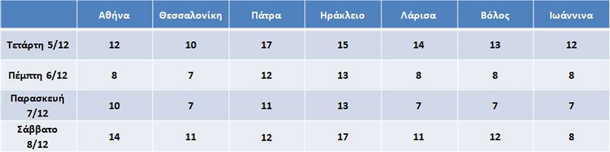Στον πίνακα που ακολουθεί παρουσιάζονται οι αναμενόμενες μέγιστες θερμοκρασίες στις μεγαλύτερες πόλεις της χώρας μας τις επόμενες ημέρες. Όπως φαίνεται, η θερμοκρασία το μεσημέρι της Πέμπτης 06/12 αναμένεται να είναι 3 έως 6 βαθμούς χαμηλότερη σε σχέση με το μεσημέρι της Τετάρτης 05/1.