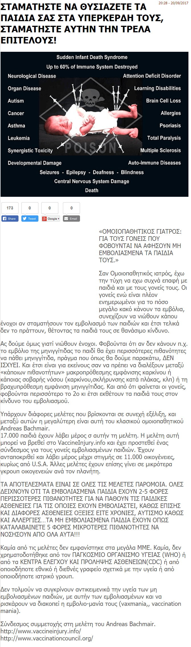 Το άρθρο της κας Λυμνιούδη, επικαλείται έρευνα του κλασικού ομοιοπαθητικού Andreas Bachmair, πάνω σε 17.000 παιδιά. Σύμφωνα με αυτή, διαπιστώθηκε πως τα εμβολιασμένα παιδιά, έχουν 3-5 φορές μεγαλύτερη πιθανότητα να αρρωστήσουν σε σχέση με τα ανεμβολίαστα.