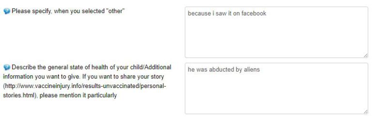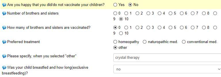 Τι σημαίνει αυτό; ότι ο οποιοσδήποτε μπορεί να συμπληρώσει ένα ερωτηματολόγιο και να δηλώσει ότι στοιχεία θέλει, χωρίς τον παραμικρό έλεγχο. Φυσικά δεν υπάρχει control group, δηλαδή μια ομάδα εμβολιασμένων παιδιών που θα μπορούσαν να χρησιμοποιηθούν ως σύγκριση με τα ανεμβολίαστα.