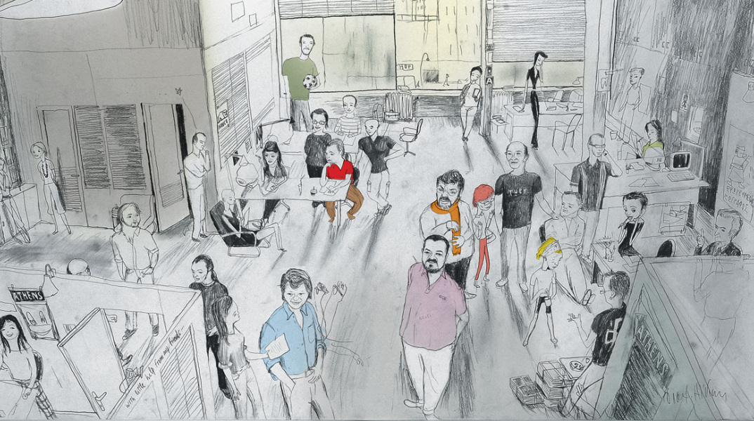 O ζωγράφος ∆ιαµαντής Aϊδίνης ζωγραφίζει και µας χαρίζει τον πίνακα “A.V. family” µε τις ασπρόµαυρες φιγούρες όλων όσοι δουλεύουν στην εφηµερίδα. (Nοέµβριος 2005)