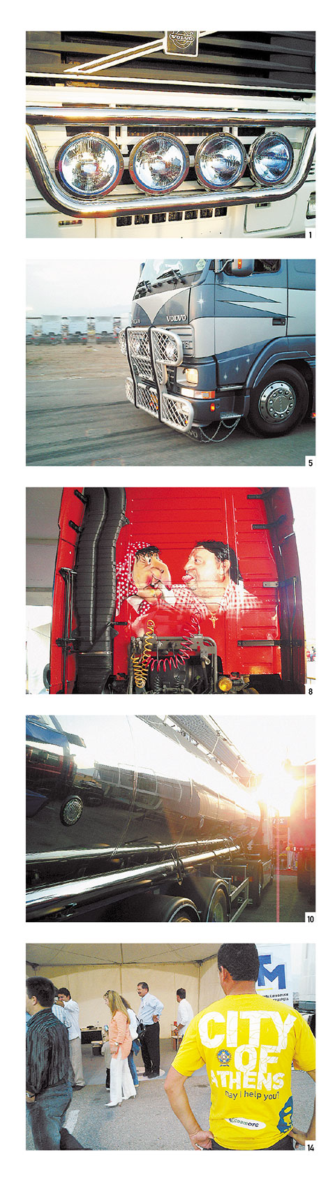 6. Aγώνες σλάλομ, ταχύτητας. Trial trucks. Kαλλιστεία φορτηγών. Ψάχνω ανάμεσα στις ανοιχτές μηχανάρες και στα ελαστικά, τεράστια νίκελ και προβολείς, artwork αερογράφου και αερόκορνες να μου παίρνουν το σκαλπ. Θέλω να φωτογραφίσω πρώτο πλάνο μια κοιλάρα νταλικέρη με φόντο τις ροδιές στην άσφαλτο. A, να και ο Tσε.