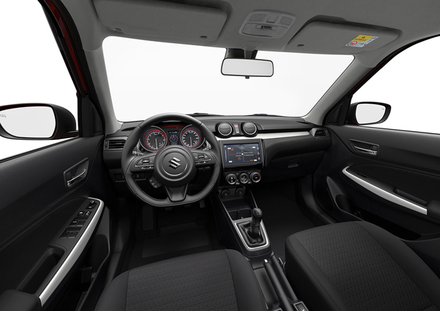 >Ο εξοπλισμός της βασικής έκδοσης του νέου Swift περιλαμβάνει aircondition, ηλεκτρικά παράθυρα εμπρός, κεντρικό κλείδωμα με τηλεχειρισμό, ηλεκτρικούς και θερμαινόμενους καθρέπτες, αυτόματη λειτουργία φώτων, ηχοσύστημα, 6 αερόσακους, ESP, φώτα ημέρας LED, δερμάτινη επένδυση τιμονιού και κάθισμα οδηγού ρυθμιζόμενο καθ’ ύψος, ενώ διατίθεται με 7 χρώματα αμαξώματος αλλά και 4 δυνατότητες διχρωμίας.