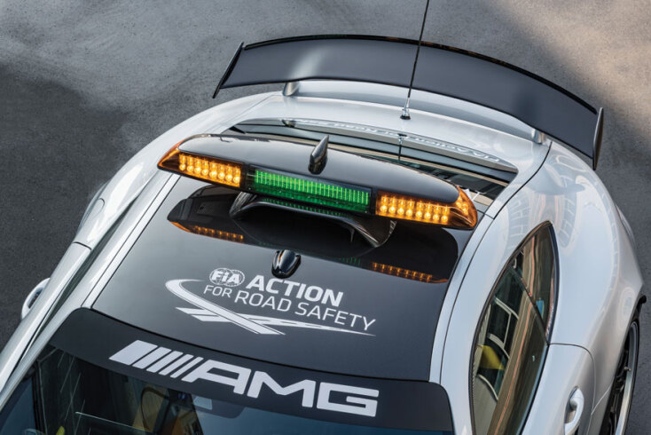 Από το 1996 το επίσημο αυτοκίνητο ασφαλείας της Formula 1 προμηθεύει η Mercedes-Benz, ενώ φέτος το νέο AMG GT R που βλέπετε στις φωτογραφίες, είναι ένα «θηρίο» 585 ίππων που αγγίζει την τελική ταχύτητα των 320 χλμ./ώρα. Είναι εξοπλισμένο με ραδιοσυστήματα, πλήρως ενσωματωμένα iPads και hotspot WLAN μέσα στο αυτοκίνητο για να εξασφαλίζει συνεχή επαφή με τον αγώνα κατά τη διάρκεια των Grand Prix, από τα δοκιμαστικά έως τον αγώνα της Κυριακής.