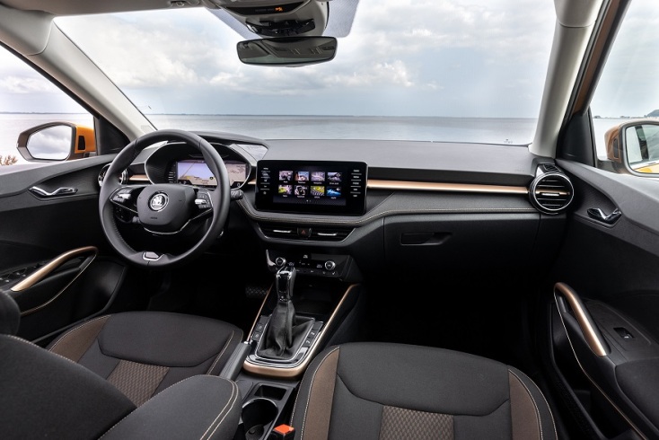 Διαθέσιμος ψηφιακός πίνακας οργάνων (Virtual Cockpit) 10,25 ιντσών, ανεξάρτητη κεντρική οθόνη αφής, μεγάλοι κυκλικοί αεραγωγοί δεξιά και αριστερά με επένδυση χρωμίου από το επίπεδο Ambition, όπως και στις λαβές στις πόρτες. Ένα ολοκαίνουργιο χαρακτηριστικό είναι η αναγραφή λέξης Fabia και στις δύο πλευρές του περιβλήματος του πίνακα οργάνων. Ξεχωρίζει το δερμάτινο διάκτινο τιμόνι σύμφωνα με το τελευταίο στυλ της Skoda ενώ ένα σπορ τιμόνι τριών ακτίνων διατίθεται έξτρα. Για πρώτη φορά σε FABIA διαθέσιμο διπλής ζώνης Climatronic.
