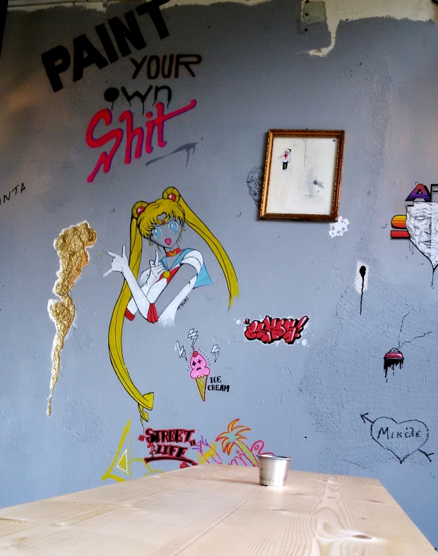 Και για να απαντηθεί το σύνηθες ερώτημα «τίνος είναι βρε γυναίκα το παιδί;» θα σας πω πως ο ανατρεπτικός εικαστικός Γιώργος Τζινούδης και μια από τις μορφές της ελληνικής street art σκηνής, ο Apset, ένωσαν τις δημιουργικές τους δυνάμεις και υπογράφουν την αύρα του μέρους. Οι μισοί τοίχοι κρύβουν έργα τέχνης κι οι άλλοι μισοί είναι ζωγραφισμένοι από τους πελάτες. «Paint your own Shit», η επιγραφή που προτρέπει τους πάντες να ταγκάρουν το πέρασμά τους από το μέρος. Έβγαλα το μαρκαδοράκι μου και έγραψα ένα μότο του Τσακ Πόλανικ. «Όλη η προσπάθεια του κόσμου δεν αρκεί, αν δεν είσαι εμπνευσμένος».