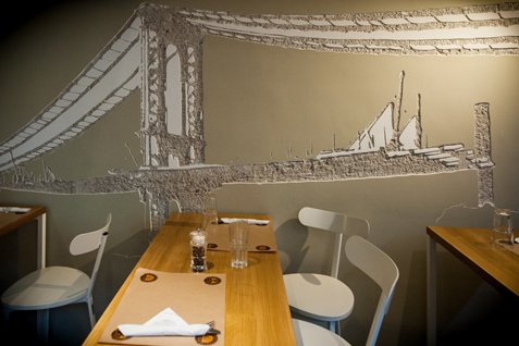 Το νέο μπεργκεράδικο είναι ένας μοντέρνος χώρος με μίνιμαλ αισθητική που αποφεύγει σκόπιμα τις αμερικανιές και τις φολκλόρ λεπτομέρειες. Εδώ ο απόλυτος πρωταγωνιστής είναι το φαγητό. Αν και ο Tάσος (ο νεαρός ιδιοκτήτης) πιστεύει ότι ένα μαγαζί δεν κρατάει τον κόσμο με τη διακόσμηση, η σκαλιστή γέφυρα του Σαν Φρανσίσκο στον τοίχο είναι το πρώτο πράγμα που πρόσεξα μπαίνοντας, ενώ και τα σκίτσα στο μαύρο πίνακα του μενού κλέβουν την παράσταση.