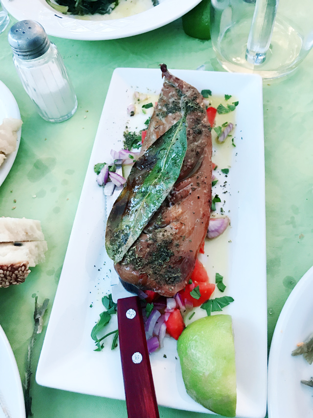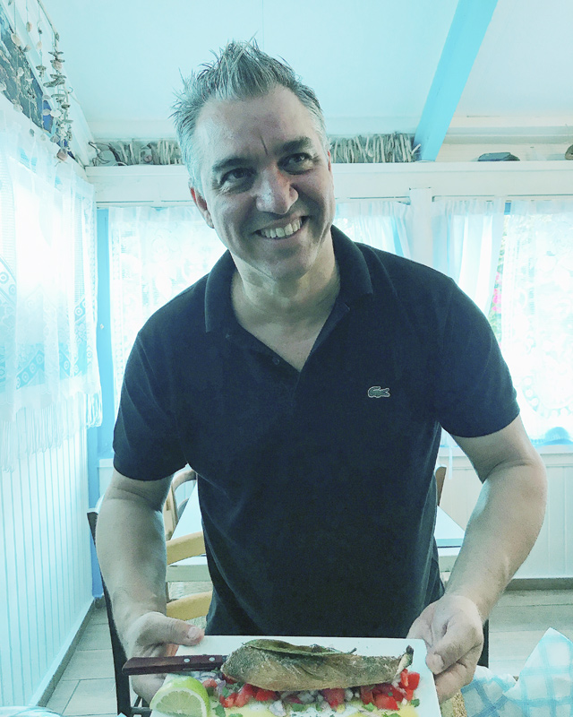 Σε 3 λεπτά, και γι’ αυτό αμέσως τους συμπαθώ, φέρνουν νερά, κρασιά (Ζίτσα, καλό), χόρτα, τυροκαφτερή. Το σταμναγκάθι είναι ζεστό και τέλεια βρασμένο, η τυροκαφτερή σε μερίδα γίγας και σπιτική, όχι νιανιά αλλά με κομμάτια καλής φέτας, οι πατάτες ακολουθούν σε πιατάκι μικρό μεν αλλά βουνό, ο παστουρμάς είναι φέτα λεπτή ψαριού κα-ρα-με-ρα-κλί-δι-κη, τα γλείφουμε όλα σε ντε τε. Μη σας τα πολυλέω, τα καλαμαράκια είχαν ωραίο τηγάνι («έχουμε και κατεψυγμένα με €7», μας έχουν πει στην αρχή, «αλλά και φρέσκα με €12, διαλέχτε»), τα φρέσκα πήραμε και ήταν ποίημα, τα γαυράκια ήταν όπως τα ζήτησα και χόρταιναν τουλάχιστον τρία άτομα.