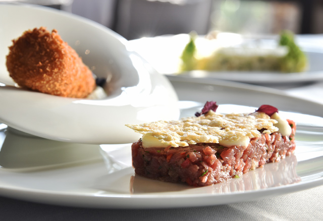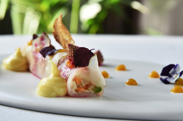 Φέτος το Όμικρον, που ανήκει στον Όμιλο Καστελόριζο, έχει στην κουζίνα του τον ταλαντούχο σεφ Μίλτο Αρμένη. Μαθητής του Jerome Serres και του Alain Ducasse, κοσμογυρισμένος μια και έχει δουλέψει από Ιταλία, Ντουμπάι και Ελβετία μέχρι Ισπανία και Παξούς, έχει και το προνόμιο της διπλής καταγωγής (Κερκυραίος από πατέρα και Ισπανός από μαμά) να μπολιάζει τις ρίζες της μαγειρικής του. Μας ξεκίνησε με ψωμάκια ζεστά και λάδι σε υπέροχο κεραμικό βάζο της κερκυραϊκής Neolea. Μας πέρασε σε πεντανόστιμη ισπανική τορτίγια με σπαράγγια. Συνέχισε με ταμπουλέ κουνουπίδι με καπνιστή ρέγγα και μους από φακές και ελληνική σαλάτα με κους κους και μους φέτας. Όλα με τέλεια παρουσίαση (πολύ κομψή και ιδιαίτερη και η art de la table) και πολύ καλή γεύση, η αλήθεια είναι πως άρχισα να προσέχω καλύτερα τι τρώω μετά από το ανυπερβλήτου νοστιμιάς καλαμάρι στη σχάρα με τσιγαρέλι (χόρτα γιαχνιστά και με μπόλικο πικάντικο κοκκινοπίπερο), που έχει εμπνευστεί από τις κερκυραϊκές του παιδικές μνήμες και από τις συνταγές της γιαγιάς του!
