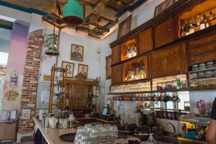 Αυτή η πολιτισμική, κοινωνικοπολιτική «κουβέρτα» απλώνεται και στον (εξίσου εντυπωσιακό) εσωτερικό χώρο. Πάνω από το bar (που αποτελείται από μπουφέδες-αντίκες και ξύλινες πόρτες φερμένες από τη Μικρά Ασία!) τα πορτραίτα των ιδρυτών της Φιλικής Εταιρείας (Ξάνθος, Τσκάλωφ, Σκουφάς), κάνουν παρέα στον Καποδίστρια, μια τεράστια τοιχογραφία του Καββαδία στο κέντρο σε κοιτάει με το γνωστό μελαγχολικό βλέμμα του ποιητή, ενώ στους αεραγωγούς είναι γραμμένο με λευκή κιμωλία όλο το «Άξιον Εστί» του Ελύτη. Στις σκάλες που οδηγούν στον πάνω όροφο θα χαζέψεις φωτογραφίες από γκράφιτι της πόλης, και τίτλους παλιών εφημερίδων. Αν είσαι καλά διαβασμένος, θα παρατηρήσεις πως μπροστά σου ξετυλίγεται όλη η νεότερη ιστορία της χώρας, κι εσύ μπορείς να περιηγείσαι στον χρόνο με την ίδια ευκολία που περιφέρεσαι στον χώρο.