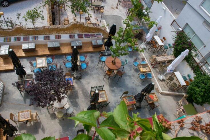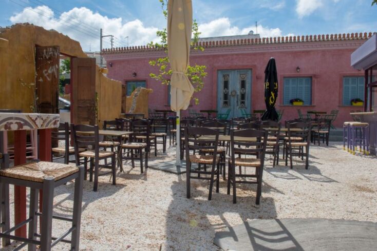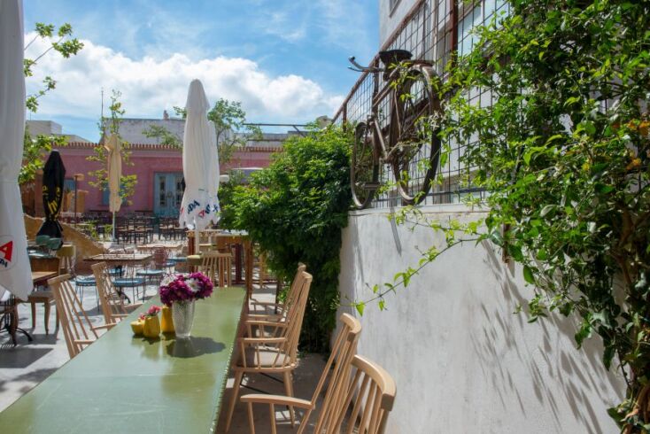 Σε αυτήν την τρομερή αυλή, οι λεπτομέρειες είναι που κάνουν τη διαφορά: τα κουτιά από μελίσσια που εκτελούν χρέη σκαμπό, οι παλιές αφίσες του ΕΟΤ που ομορφαίνουν τους τοίχους, οι γλάστρες με τους βασιλικούς σε κάθε σκαλί τις στριφογυριστής σκάλας, το πιστό αντίγραφο ενός παλιού περιπτέρου σε μια άκρη, τα τραπέζια-κορνίζες που φιλοξενούν πίνακες ελλήνων ζωγράφων. Όπου κι αν κοιτάξεις θα βρεις ένα κομμάτι της ελληνικής ιστορίας να αναβιώνει κάποια περασμένη, ρομαντική δεκαετία…
