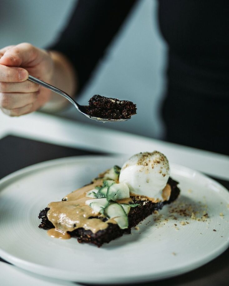 Για το τέλος, θα βρείτε δύο γλυκάκια: ένα cheesecake με κατίκι Δομοκού, πετιμέζι, αποξηραμένο σύκο, ψημένα φουντούκια και φράουλα (€7) και μια άκρως πληθωρική σοκολατόπιτα με κόκκινο μήλο, καρύδι, μέλι Κρήτης, κολοκυθάκι, φιστικοβούτυρο που φτιάχνεται εδώ και παγωτό βανίλια χωρίς ζάχαρη (€8).