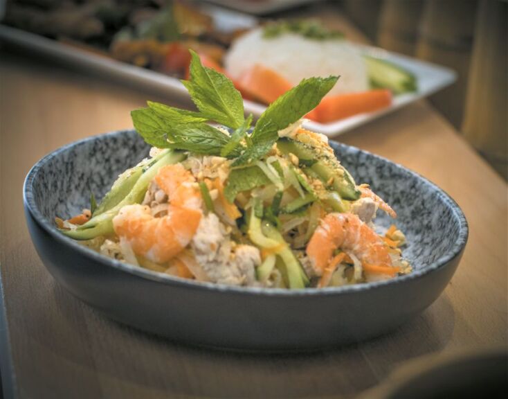 Άλλο must είναι τα bao bun ψωμάκια στον ατμό, με καραμελωμένο χοιρινό, τραγανό αγγούρι και λαχανικά. Επίσης τα Cha gio, ή τηγανητά ρολά της Άνοιξης, με φύλλο ρυζιού, noodles, καρότο και χοιρινό κιμά που τα σερβίρουν με τραγανά φύλλα σαλάτας και φρέσκο δυόσμο – αυτή η αντίθεση του φρεσκοτηγανισμένου ρολού με τη δροσερή σαλάτα και τα μυρωδικά είναι ένα ποίημα! Επίσης, και τις σαλάτες πρέπει να δοκιμάσετε οπωσδήποτε. Οι Βιετναμέζοι, σε αντίθεση με τους άλλους Ασιάτες, τρώνε πολλά ωμά λαχανικά. Η πρώτη στον κατάλογο με noodles ρυζιού, φρέσκα λαχανικά, καραμελωμένο χοιρινό, και τηγανητά ρολά, είναι κατά τη γνώμη μου η καλύτερη. Αλλά επίσης πολύ καλή είναι αυτή με παπάγια, γαρίδες και φιστίκια. Άλλο, κλασικά βιετναμέζικο πιάτο, είναι το μαριναρισμένο χοιρινό στο γκριλ. Ζητήστε να σας το σερβίρουν με noodles και όχι με ρύζι ατμού –όπως το έχει ο κατάλογος– τα κάνουν καλά.
