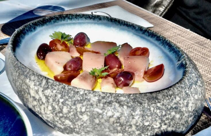 - Ταρτάρ κιτρινόπτερου τόνου (τόνος μαριναρισμένος, αβοκάντο, αγγούρι, αλάτι αφρίνα, πιπέρι, ρόδι) με διάφορες ζωγραφικές και γευστικές πινελιές,