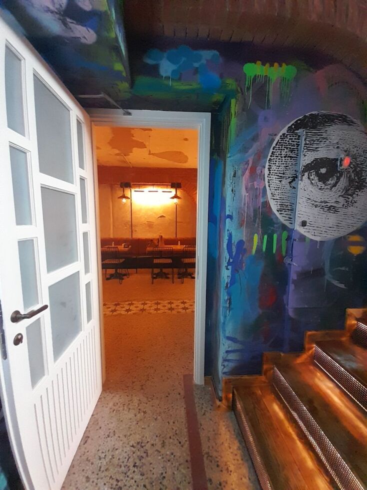 Στη βάση της σκάλας πια, μπορώ να κρυφοκοιτάξω στη σάλα. Eκεί με περιμένει ένας άλλος κόσμος, μίλια μακριά από την πλατεία Καρύτση … Δερμάτινα booths, απλίκες που στέλνουν ζεστό φως στα ξύλινα τραπέζια, μια μεγάλη μπάρα με κόκκινο τούβλο γύρω της. Νιώθω σαν να έχω μεταφερθεί σε άλλη εποχή και ήπειρο, θα έλεγα κάπου στην εποχή της ποτοαπαγόρευσης και σίγουρα στην καρδιά της Νέας Υόρκης.
