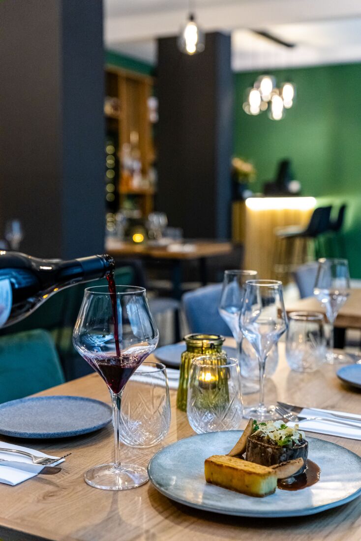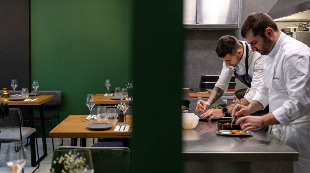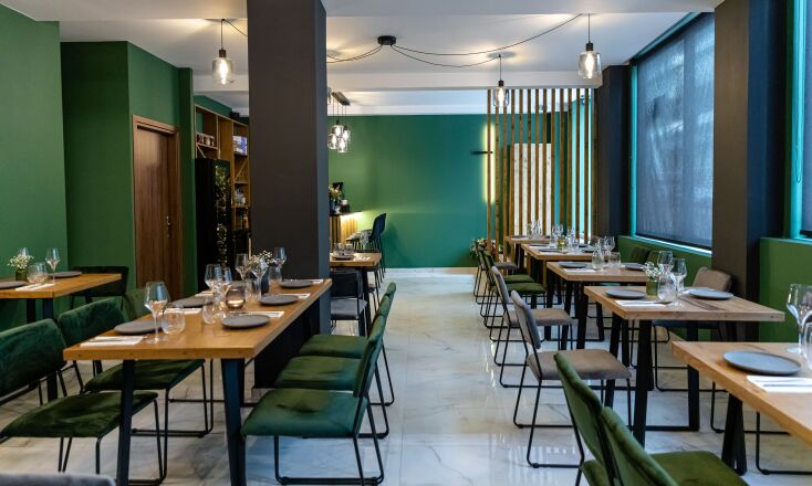 Η αισθητική είναι μίνιμαλ και σύγχρονη, με το σκούρο πράσινο και το μαύρο-ανθρακί να κυριαρχούν, και το ξύλο -στα δρύινα τραπέζια και τη σκάλα από καρυδιά- να συμπληρώνει με θερμούς τόνους τον χώρο.