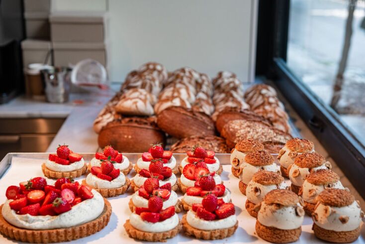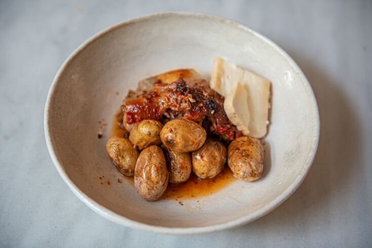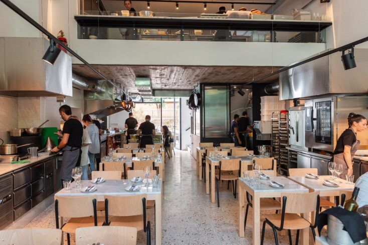 Το μαγαζί είναι αυτής της λιτής αισθητικής που συνηθίζεται τελευταία, ναι, το πάτωμα είναι μωσαϊκό και έχει ράφια με μπολάκια στους τοίχους αλλά εδώ δεν μένεις στο ντεκόρ, στο βάθος σε τραβάει η ζωντανή φωτιά που ψήνει την έμπνευση του μάγειρα, το μεγάλο τραπέζι μπροστά της, η βιτρίνα με τα γλυκά και τα ψωμιά του Σπύρου (μπορείς να τα αγοράσεις και για το σπίτι), μια δημιουργική κυψέλη, μια work in progress κουζίνα ανοιχτή μπροστά σου, ή αλλιώς τα μέσα-έξω ενός εστιατορίου στη φόρα και στη μέση ο πελάτης, στο πεζοδρόμιο μικρά μεταλλικά τραπεζάκια που με δυσκολία χωράνε τα πιάτα-μπολάκια, να αράξεις χαλαρά θα δυσκολευτείς.