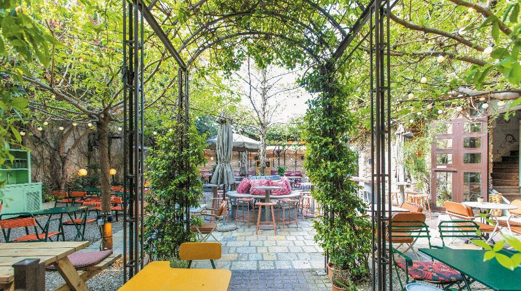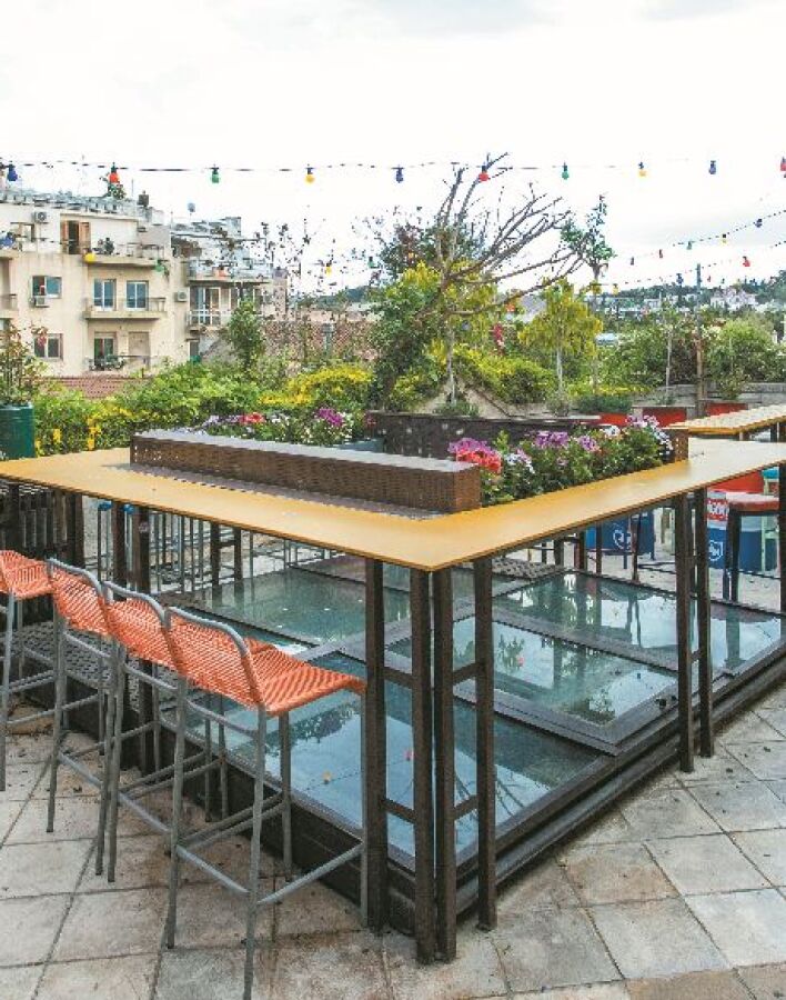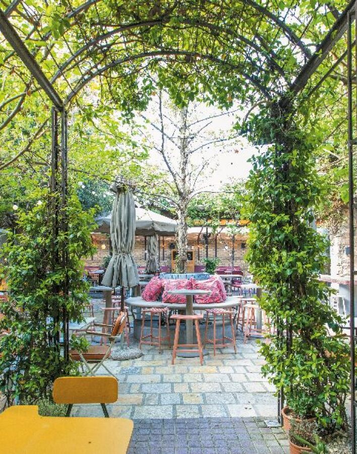 Μια πελώρια και πολύχρωμη αυλή με φουντωτά γιασεμιά και πολύχρωμες βουκαμβίλιες, θα σε κάνουν να πιστέψεις πως φύσηξε αεράκι σε κάποιο Αιγαιοπελαγίτικο νησί. Ανεβαίνοντας τα σκαλιά για το δεύτερο όροφο στον ίδιο χώρο, σε περιμένει μια ταράτσα γεμάτη καλαμωτές, πολύχρωμα λαμπάκια και φαντεζί καθίσματα για δροσερά βράδια με θέα το φεγγάρι.