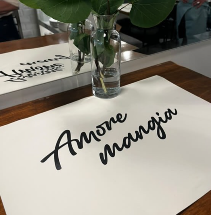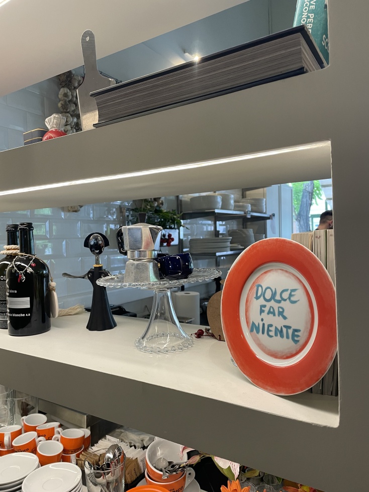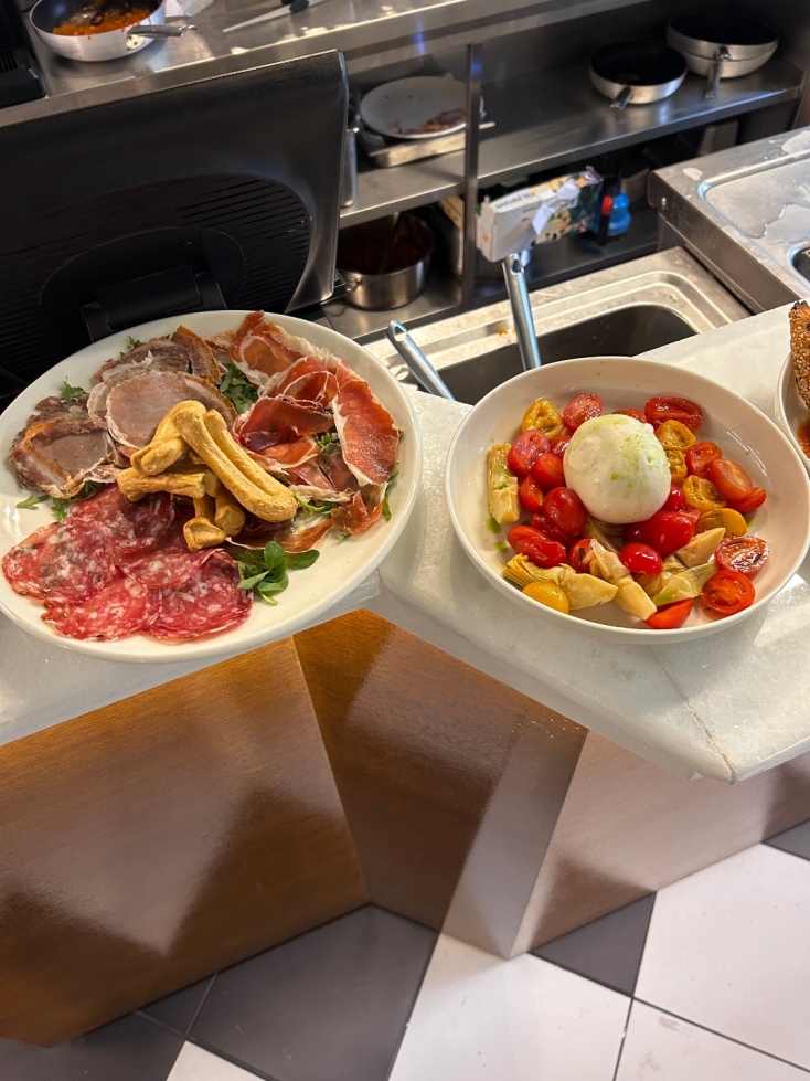 Κάθομαι σε ένα ξύλινο τραπέζι του Via della Pasta, κάτω από ένα ράφι με βιβλία μαγειρικής και έναν τοίχο γεμάτο χρωματιστά πιατάκια με ιταλικά ρητά και φράσεις, όπως το δικό μου αγαπημένο «dolce far niente». Παρατηρώ τι γράφει πάνω στα σουπλά: «Amore mangia», ή αλλιώς «αγάπη φάε», μια πολύ γλυκιά έκφραση και, ναι, ξαφνικά μου ανοίγει κι άλλο η όρεξη! Αρχίζουμε με Affettato Misto· προσούτο Πάρμας, σαλάμι φινοκιόνα και πορκέτα, σερβιρισμένα με τραγανά taralli pugliesi (μικρά αλμυρά «μπισκοτάκια»).