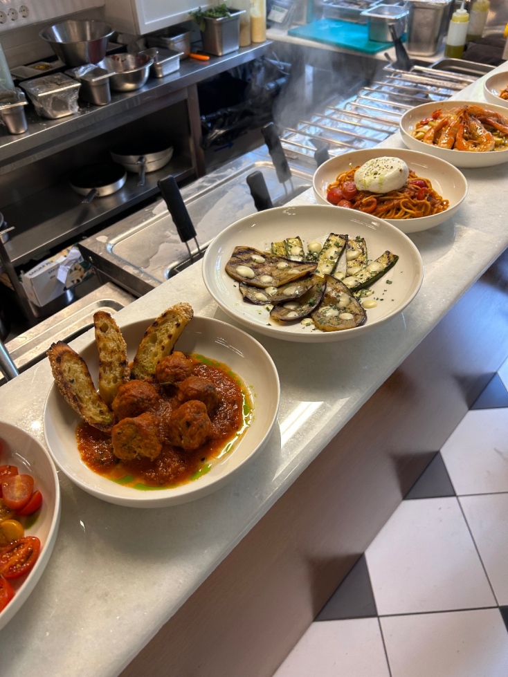 Ήταν σαν να πέρναγαν από μπροστά μας μικρές καρτ ποστάλ από πόλεις της Ιταλίας. Συνεχίζουμε με τις bruschette: μία με γκοργκοντζόλα και φιστίκι, και άλλη μια με ντομάτα και πλούσιοπροσούτο. Η στιγμή όμως που οι συζητήσεις σταμάτησαν στο τραπέζι ήταν όταν ήρθαν οι κεφτέδες με σάλτσα ντομάτας και βασιλικό. Η σάλτσα ήταν τόσο ζωντανή, τόσο σπιτική, που σχεδόν «άκουγες» την μυστική οικογενειακή συνταγή. Απλές πρώτες ύλες, που όμως μιλούσαν. Ανοίγουμε ένα μπουκάλι Allegrini Lugana, από τη Λομβαρδία - δροσερό, κομψό λευκό κρασί, που στροβιλίζεται στο ποτήρι και ύστερα χορεύει στον ουρανίσκο.