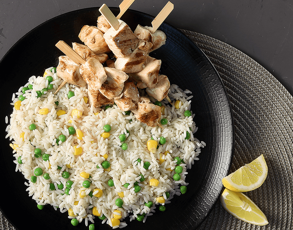 Μαριναρισμένο κοτόπουλο σε sticks με ρύζι, καλαμπόκι και αρακά