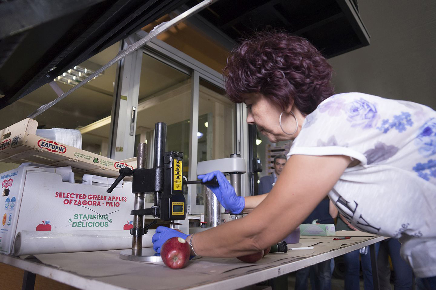 Η γεωπόνος Ιουλία Παπούλια μετράει την αντίσταση για να διαπιστώσει την τραγανότητα του μήλου.