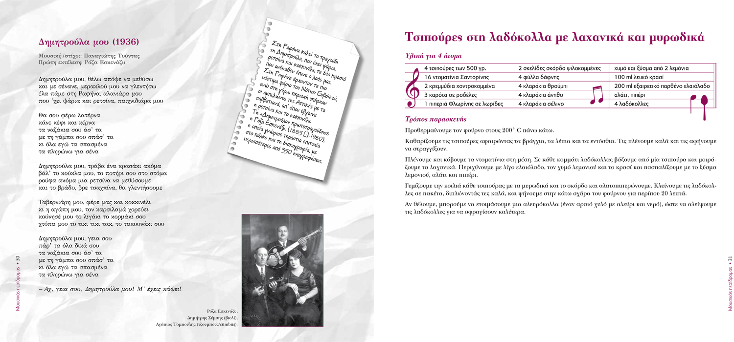 Την άνοιξη που μας πέρασε ο Νίκος Φωτιάδης εξέδωσε το βιβλίο «Μουσικός Περίδρομος». Κι εκεί συγκέντρωσε τα ρεμπέτικα μέσα στα οποία το φαγητό εμφανίζεται σαν καθημερινό στοιχείο της ζωής των ανθρώπων αλλά και σαν καθοριστικό στοιχείο της εποχής. Στη μια σελίδα είναι το τραγούδι με τους στίχους του, στην απέναντι ο σεφ παραθέτει και τη συνταγή του πιάτου που…τραγουδιέται, σε μορφή πενταγράμμου. Μαζί υπάρχει κι αυτή η μικρή και τόσο χαρακτηριστική ιστορία του.