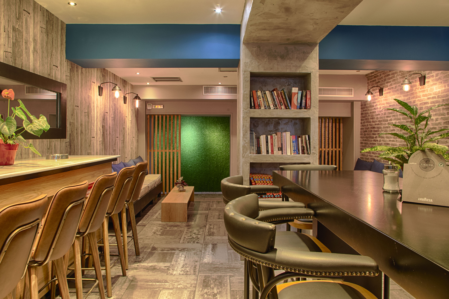 Και μετά από όλη αυτή την εισαγωγή, ανοίγω την πόρτα και φτάνω στο λόγο που το Blue Bear μου αρέσει τόσο πολύ. Μπροστά απλώνεται το ισόγειο της πολυκατοικίας σε όλο το μεγαλείο του. Μεγάλος, ευρύχωρος ψηλοτάβανος χώρος. Αριστερά η μεγάλη μπάρα, δεξιά η μπλε αρκούδα, από πάνω της τα τρομερά φωτιστικά που έφτιαξε ο Αντριάνος. Προχωράω στο βάθος βλέπω μια χτιστή βιβλιοθήκη γεμάτη με βιβλία κάθε είδους. Από λεξικά, μέχρι βιβλία για τη διάσημη πολυκατοικία και εύπεπτη λογοτεχνία δίπλα σε δοκίμια.