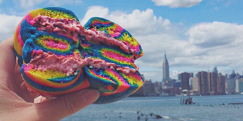 Έγιναν viral το 2016 όταν το The Bagel Store τα πρωτοκυκλοφόρησε στο κοινό και από τότε όλος ο κόσμος έχει χάσει τα μυαλά του, σε σημείο που αρκετοί έχουν κλείσει εισιτήριο για Νέα Υόρκη μόνο και μόνο για να τα δοκιμάσουν. Τα bagels είναι από μόνα τους ένα κλασσικό νεοϋορκέζικο "γρήγορο" φαγητό που πρέπει να γευθείς, αλλά όταν έχουν τα χρώματα του ουράνιο τόξου και γέμιση από κρέμα τυριού και χρωματιστή τρούφα μετατρέπονται σχεδόν σε αξιοθέατο. Όντως μοιάζουν λίγο με πλαστελίνη δεν είσαι ο μόνος που το σκέφτηκε.