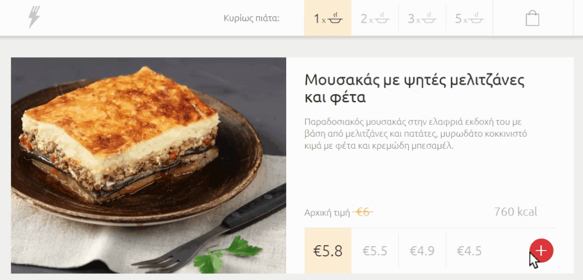 Και το καλύτερο; Όσο πιο πολλά κυρίως πιάτα προσθέτεις στο καλάθι σου, τόσο πιο πολύ μειώνονται οι τιμές! Για παράδειγμα, ο μουσακάς με ψητές μελιτζάνες και φέτα (αλήθεια το έχεις δοκιμάσει αυτό; Αν όχι χάαανεις!) έχει αρχική τιμή €6. Αν όμως παραγγείλεις δύο οποιεσδήποτε κυρίως μερίδες η τιμή πέφτει στα €5,80, με τρεις γίνεται €5,5 και με πέντε φτάνει τα €4,5!