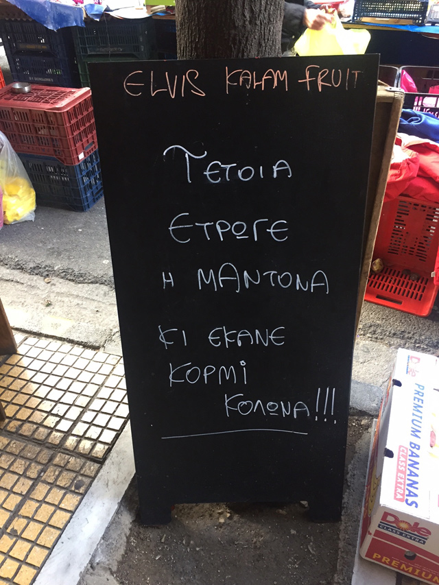 Πάνω εκεί στο βαθυστόχαστο, έτοιμη και η παραγγελία μου. Βγάζω σαν ευρωπαία την καρτούλα μου να πληρώσω, δεν δεχόμαστε μου λένε. Αρχίζω να γκρινιάζω για το πώς είναι δυνατόν, εν έτη δυο χιλιάδες δέκα επτά να μην δέχεστε ηλεκτρονικές συναλλαγές, πώς θα πάμε μπροστά, με σταματά ατάραχος και χαμογελαστός ο κύριος που με κέρασε την τσικουδιά: «Μην σε νοιάζει, φάε να τα ευχαριστηθείς και μου φέρνεις την άλλη φορά τα λεφτά»…