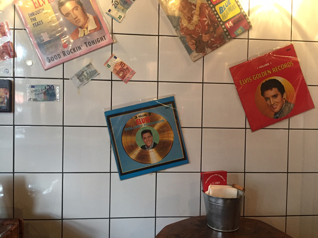 Καλά, δεν πήγα και μακριά, τοίχο- τοίχο με το Τσέλσι συνορεύει ο «Έλβις» το «Καλλιτεχνικόν ψητοπωλείον»-φυσικά αδερφάκι του πασίγνωστου Έλβις στο Μεταξουργείο. Μπαίνω μέσα σε παραδοσιακό σουβλατζίδικο, απέριττο και απλό με πάγκους κοπής κρέατος κρεοπωλείου αντί για τραπέζια. «Ναι γεια σας θα ήθελα…», «Πιείτε μια ρακή πρώτα» με διακόπτει ο κύριος επί των παραγγελιών ε, την ήπια κι εγώ, μην τον προσβάλλω, παραγγέλνω τρία τυλιχτά, μου απαντά «δεν έχω, μόνο καλαμάκι σκέτο, το σερβίρω με ψωμάκι και πατατούλα». Έχει καλώς, αλλάζω την παραγγελία και παρατηρώ γύρω μου φωτογραφίες του Elvis Presley, covers από δίσκους του, πλαστά χαρτονομίσματα κολλημένα στους τοίχους και μια πινακίδα που γράφει «Τέτοια έτρωγε η Μαντόνα και έκανε κορμί κολώνα!».