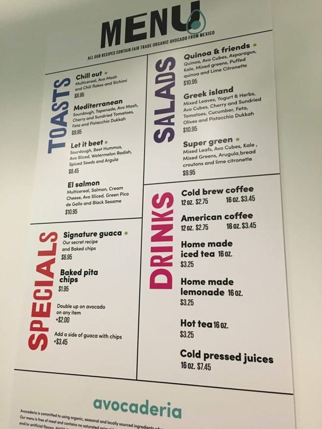Εκτός από μία μεγάλη ποικιλία τοστ με αβοκάντο, τα λεγόμενα avo -toasts (όπως τοστ με παντζάρι και αβοκάντο) σερβίρει σαλάτες, smoothies και φυσικά γουακαμόλε, τη σάλτσα με βάση το αβοκάντο. Η ιδέα για τη δημιουργία του εστιατορίου ανήκει σε τρεις φίλους από την Ιταλία, ένας από τους οποίους έζησε στην πατρίδα του αβοκάντο, το Μεξικό. Εμπνευσμένοι από τη χρήση του αβοκάντο στη μεξικανική κουζίνα θέλησαν να κάνουν το υγιεινό superfood γνωστό στον κόσμο και μάλιστα σε αμέτρητες εκδοχές.