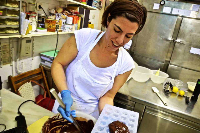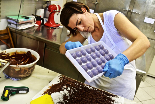 Ήρθε η ώρα της γέμισης της σοκολάτας με τη φέτα και το λοιπό μείγμα! Υπομονετικά ένα-ένα τα καλουπάκια γεμίζονται από τη Σωτηρία που το γλεντά!
