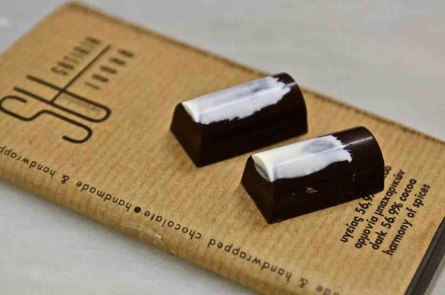 Τα υλικά μάς τα φανέρωσε χωρίς ενδοιασμούς. Για τη γέμιση χρησιμοποιούνται λευκή σοκολάτα, φέτα μαλακή, τρίμμα λεμονιού, μαντζουράνα, αγουρέλαιο Κριτσάς Gaea , γλυκόζη, λευκό κρασί και για το κέλυφος πικρή σοκολάτα με αγουρέλαιο Κριτσάς Gaea.