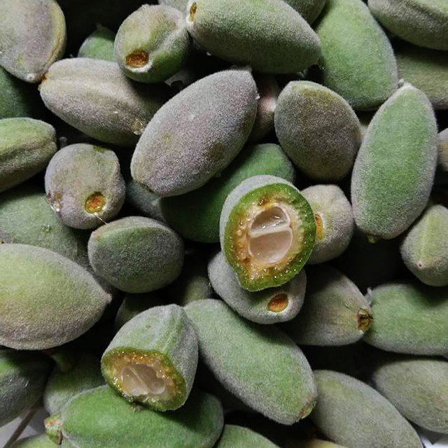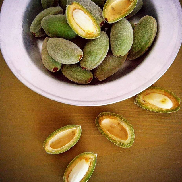 Τελικά κατάφερα και βρήκα μερικά, που ήταν στο όριο να παραγίνουν, μια κι ο πυρήνας τους γίνεται γρήγορα ξυλώδης και μετατρέπεται σε αυτό που αναγνωρίζουμε ως αναποφλοίωτο αμύγδαλο. Ξεδιάλεξα τα πιο ώριμα και τα έκοψα στη μέση, για να απολαύσω το χλωρό τους μυγδαλάκι, αφράτο και τραγανό συνάμα. Διάβασα πως το βάζουν έτσι όπως είναι σε γλυκά του κουταλιού και πως στην Κύπρο (κι όχι μόνο) το κάνουν ολόκληρο γλυκό του κουταλιού. Επίσης, σε πολλές περιοχές και κυρίως στην Κρήτη τα μαγειρεύουν με διαφόρους τρόπους κι υλικά. Τα λιγοστά που ήταν πιο μικρά και άγουρα, τα έκανα τουρσί, που ξέρω πως είναι πολύ αγαπητό σε χώρες της Μέσης Ανατολής.