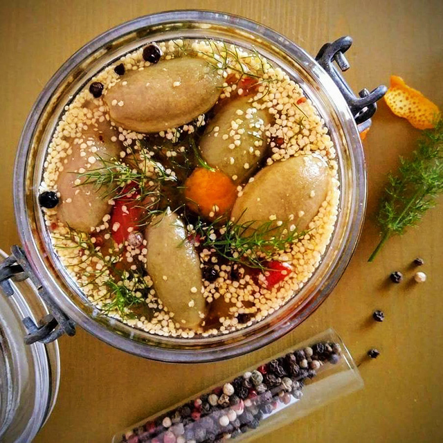 Ετοίμασα μια οξάλμη (πώς αλλιώς να πεις το… brine;) βράζοντας λίγο νερό με ξίδι κι αλάτι, αρωματίζοντας το με ό,τι είχα πρόχειρο εκείνη τη στιγμή, δηλαδή διάφορα πιπέρια σε κόκκους, μάραθο, σιναπόσπορο, κόκκινη πιπεριά και λίγη πορτοκαλόφλουδα (μην ξεχνάμε την καλαματιανή καταγωγή). Έριξα το καυτό διάλυμα στο βαζάκι με τα τσάγαλα, αφού πρώτα τα είχα τρυπήσει βαθιά, με ένα μεταλλικό σουβλί από τη μεριά του κοτσανιού, για να απορροφήσουν τις γεύσεις και τα αρώματα. Το έκλεισα και το έβαλα στο ψυγείο και περίμενα μερικές μέρες, μέχρι που δεν άντεξα και δοκίμασα.