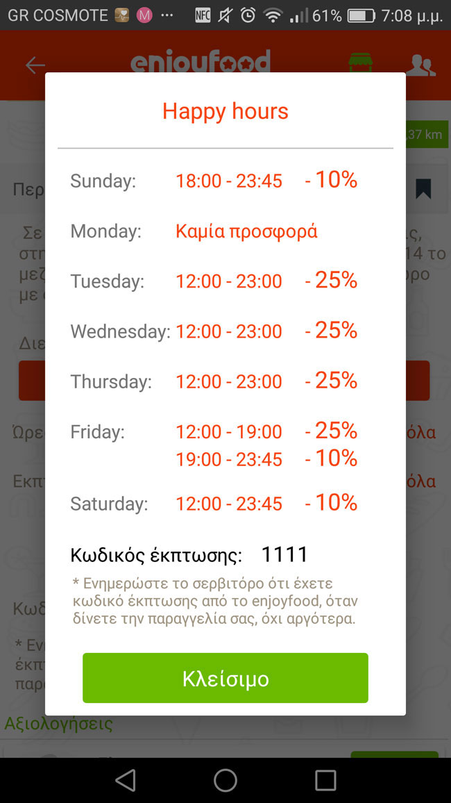 Βέβαια, τα καλά νέα δεν σταματούν εκεί. Εκτός από τη δυνατότητα να δεις ακριβώς τι είναι αυτό που σκοπεύεις να παραγγείλεις, υπάρχουν κι άλλα προνόμια. Όντας χρήστης του Enjoyfood μπορείς να επωφεληθείς των προσφορών που υπάρχουν αποκλειστικά στην εφαρμογή και να απολαύσεις το γεύμα σου με έκπτωση έως και 25% -λέγοντας τον κωδικό έκπτωσης στην αρχή της παραγγελίας σου στο εκάστοτε κατάστημα.