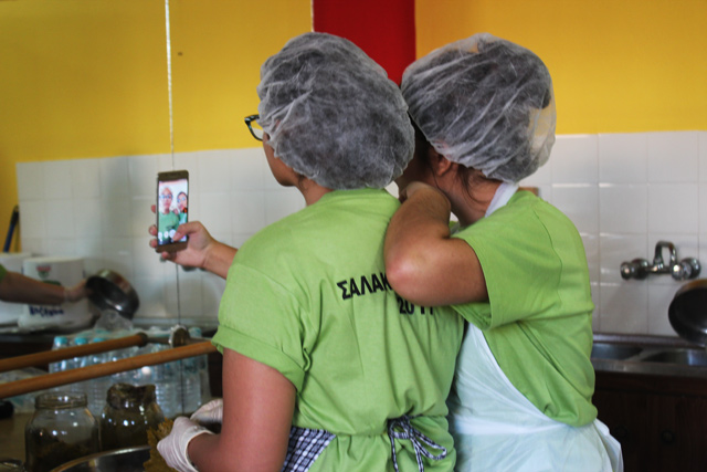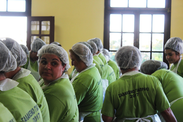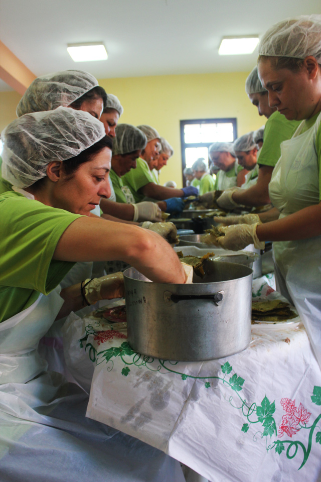 Δίπλα, στη μικρή Παρασκευή («ετών 7,5!», μου είπε με στόμφο), η γιαγιά της δεν χρειάζεται να της δείξει πώς να τυλίξει τα γιαπράκια. Το ξέρει ήδη. Είναι όμως οι δυο τους ένα όμορφο και τόσο αντιπροσωπευτικό θέαμα… μέσα σε αυτή την αίθουσα θα συναντήσεις τέσσερις γενιές γυναικών, από την εγγονή μέχρι την προγιαγιά, όλες αφοσιωμένες στο σκοπό. Η μικρότερη είναι 7,5, η μεγαλύτερη 92. Όλες είναι ενωμένες.