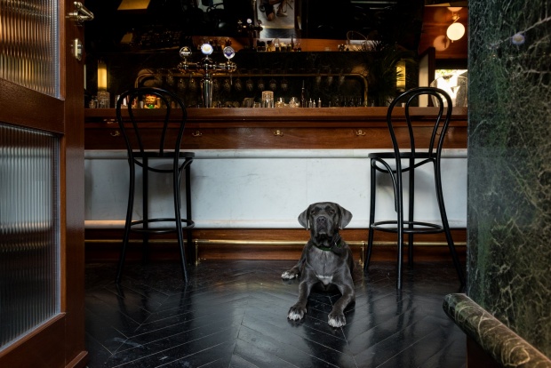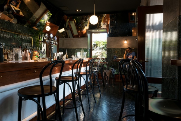 Μόλις περάσεις το κατώφλι της ξύλινης πόρτας, ξεπροβάλει ένα cozy αλλά και ταυτόχρονα επιβλητικό μπαρ. Πιθανό να σε υποδεχθεί και η Ολίβια, ο ημίαιμος σκύλος του Ερρίκου Τσόχου που μοιράζει το χρόνο της ανάμεσα σε bracket και Χου. Το design έχουν επιμεληθεί οι Ιταλοί αρχιτέκτονες και αδέρφια Giuseppe και Maurizio Alito. Πρωταγωνιστές το πράσινο τηνιακό μάρμαρο, το ξύλο και ο μπρούτζος που δένουν αρμονικά δημιουργώντας μια 20’s ατμοσφαίρα. Τη συμπληρώνουν εξαιρετικά οι γλόμποι με τον διακριτικό φωτισμό, ένας εντυπωσιακός ξύλινος ανεμιστήρας οροφής και οι μεγάλοι καθρέφτες πάνω από το μπαρ και δεξιά και αριστερά του χώρου.